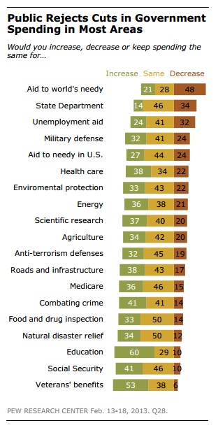 For instance, a Pew poll in February found that 70% of Americans, including 65% of Democrats, wanted the President and Congress to act on deficit-cutting legislation this year. But another Pew poll released just a day (PDF) later found that Americans don’t want to cut any individual programs except foreign aid (to the right).