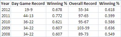 If you continue back a few years, the trend generally continues though it is not quite as clear cut. Except for in 2009, the Yankees have won a much higher percent of their day games each year than their overall record (which is skewed upwards by those day games as well). In fact, the Yankees have won 65.5% of their day games since 2008. That’s a huge percent.