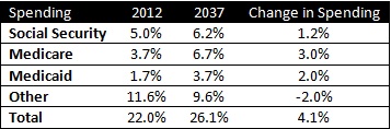 Since the extended alternative baseline scenario more closely aligns with the American Taxpayer Relief Act (which extended the Bush tax cuts) and expected future policy, I will use CBO’s projections under it. As you can see from the table above, federal spending is predicted to increase significantly over the next 25 years as a percentage of GDP and that increase is driven entirely by growth in entitlements.